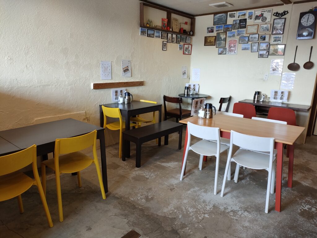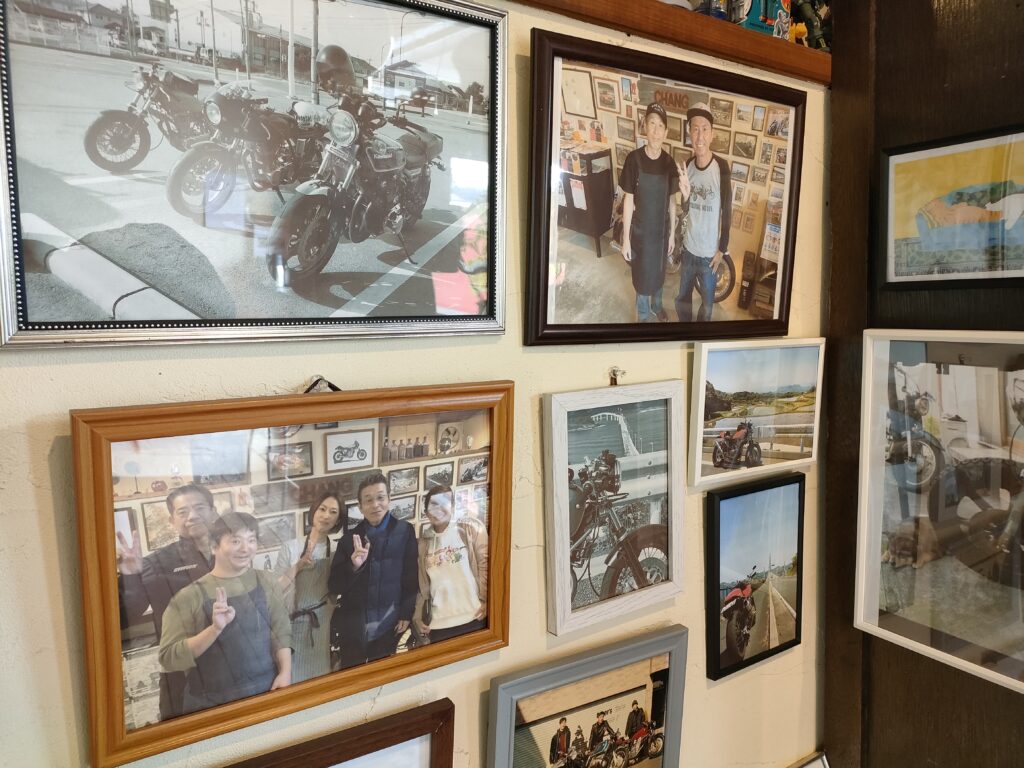 店内にバイクの展示があったり、バイク関連の写真が多く貼られています。