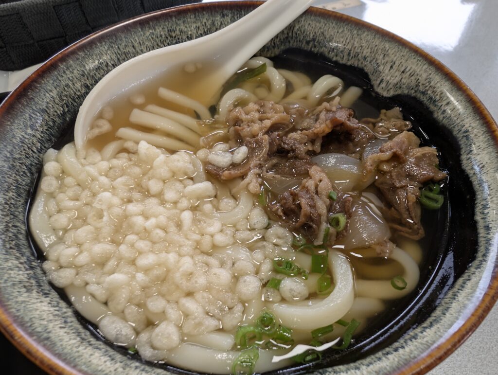 牛肉うどん。天かすとお肉、玉ねぎなどが入ったシンプルなうどんです。